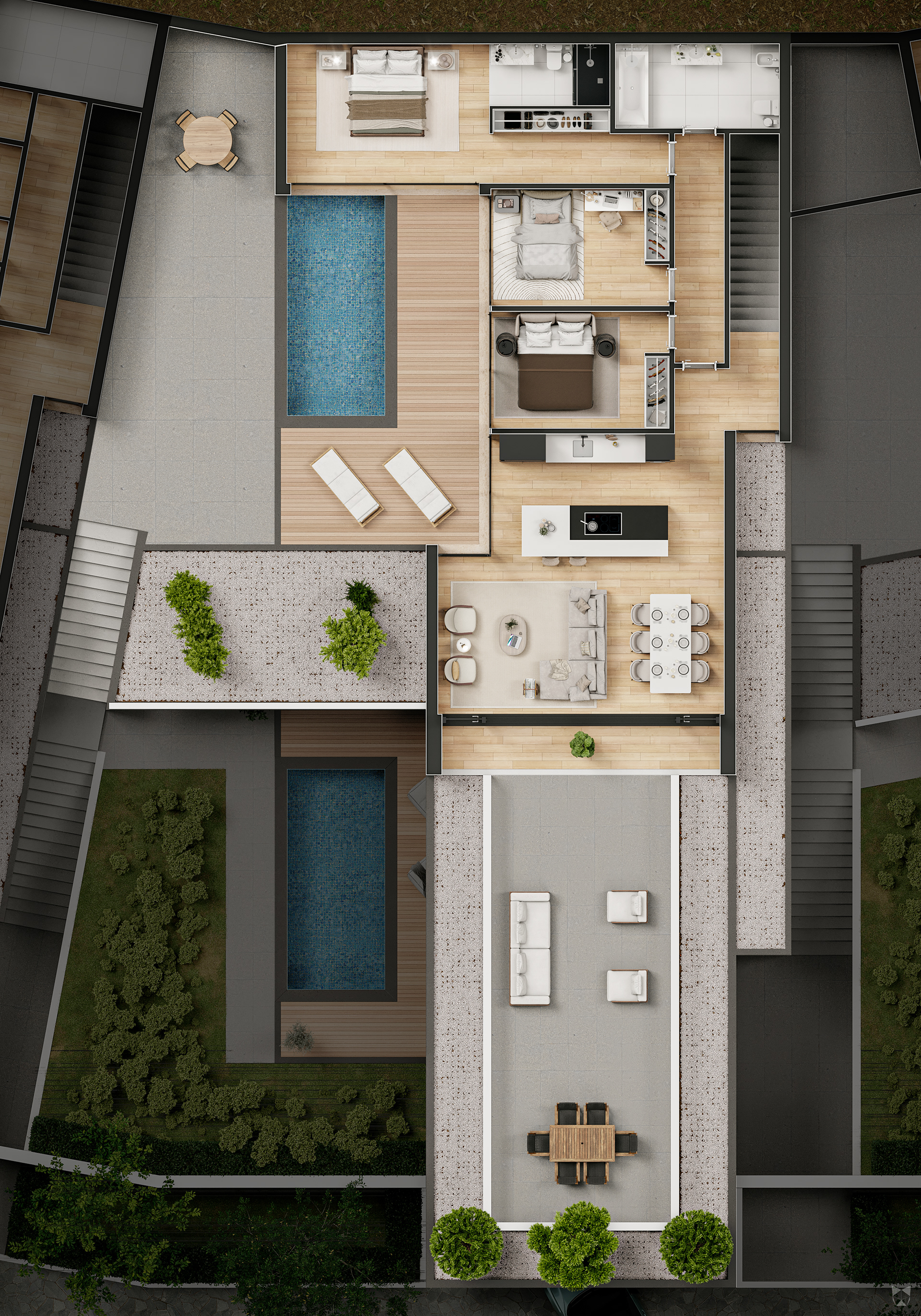 Imagens por nós do Estúdio Arca 3D, o projeto prevê moradias que se escalam em níveis, onde os ambientes vão se sobrepondo criando vistas de contemplação.